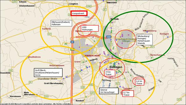 Im Nordosten der Stadt, Herberhausen und Nikolausberg bietet sich nach Einschätzung von Herrn Augustin keine Biogasproduktion an, weil die Landwirtschaftsflächen ungünstiger sind (kälter, höher, weniger fruchtbar), zudem sind insgesamt keine größeren Flächen verfügbar, was größere Transporte implizieren würde, die wiederum in einer Hügellandschaft sehr aufwändig wären. Da hier auch Erdgasnetze liegen, liegt hier keine Chance für Biogasanlagen wie in Jühnde. Hier könnte man an kleine Insel-Wärmenetze denken, die mit Holzheizungen betrieben werden, da hier genügend Wald vorhanden ist (s. auch Kap. 2.1).