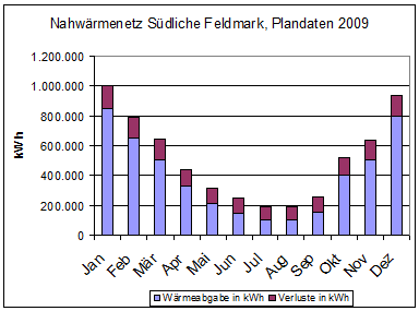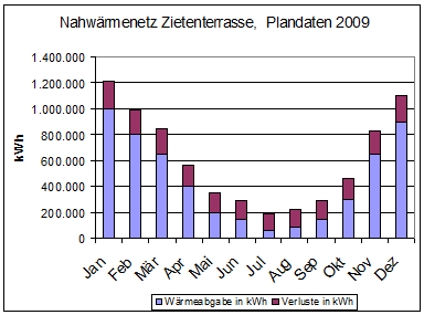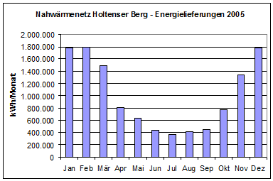 In den Abbildungen 3 und 4 sind die Plandaten der Bruttowärmeabgabe pro Monat für 2009 (Wärmeabgabe an Kunden plus Netzverluste) in kWh in die Wärmenetze Südliche Feldmark und Zietenterrassen dargestellt. Abbildung 5 zeigt die monatlichen Energielieferungen an das Holtenser Netz (Datengrundlage 2005) der Wohnungsbaugesellschaft. Durch das Holtenser Netz wird mit ca. 12 Mio. kWh/Jahr die größte Energiemenge transportiert. Im Vergleich dazu sind die Netze der Zietenterrassen und der Südliche Feldmark kürzer und es wird mit 7,3 und 6,1 Mio. kWh deutlich weniger Energie in die Netze abgegeben.